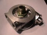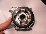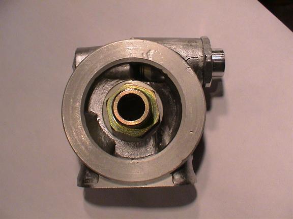 Sobald sich das Öl über die Öffnungstemperatur des Thermostaten erwärmt hat, verschließt der Kolben den direkten Durchgang zwischen Oberseite und Unterseite. Das Öl muß durch den großen Kreislauf mit Ölkühler