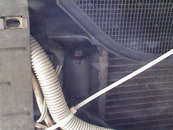 Von dort fliesst das Wasser nach vorn, im Kühler von unten nach oben, kommt im Rohr außen am Kühler wieder herunter und fließt im fahrerseitigen Schlauch / Rohr wieder zum Motor zurück.