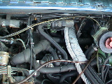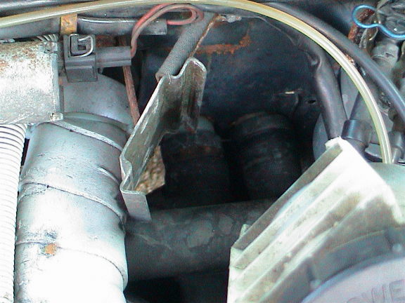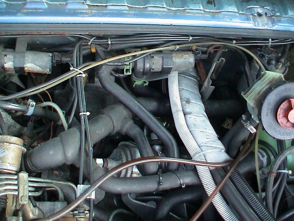 Das Kühlsystem: heißes Wasser vom Zylinderkopf (dicker Schlauch ganz oben im Motorraum) geht auf das rechte Rohr (siehe rechtes Bild). Dieses Rohr war an beiden Enden beschädigt, weil es die größten