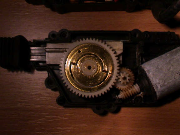 Der mit 12V angetippte Kontakt setzt den Motor in Bewegung welcher sich selbst abschaltet indem er die Anschlüsse durch die Kontakte an der Zahnradunterseite umpolt. Der benutzte Anschluß liegt anschliessend auf 12V